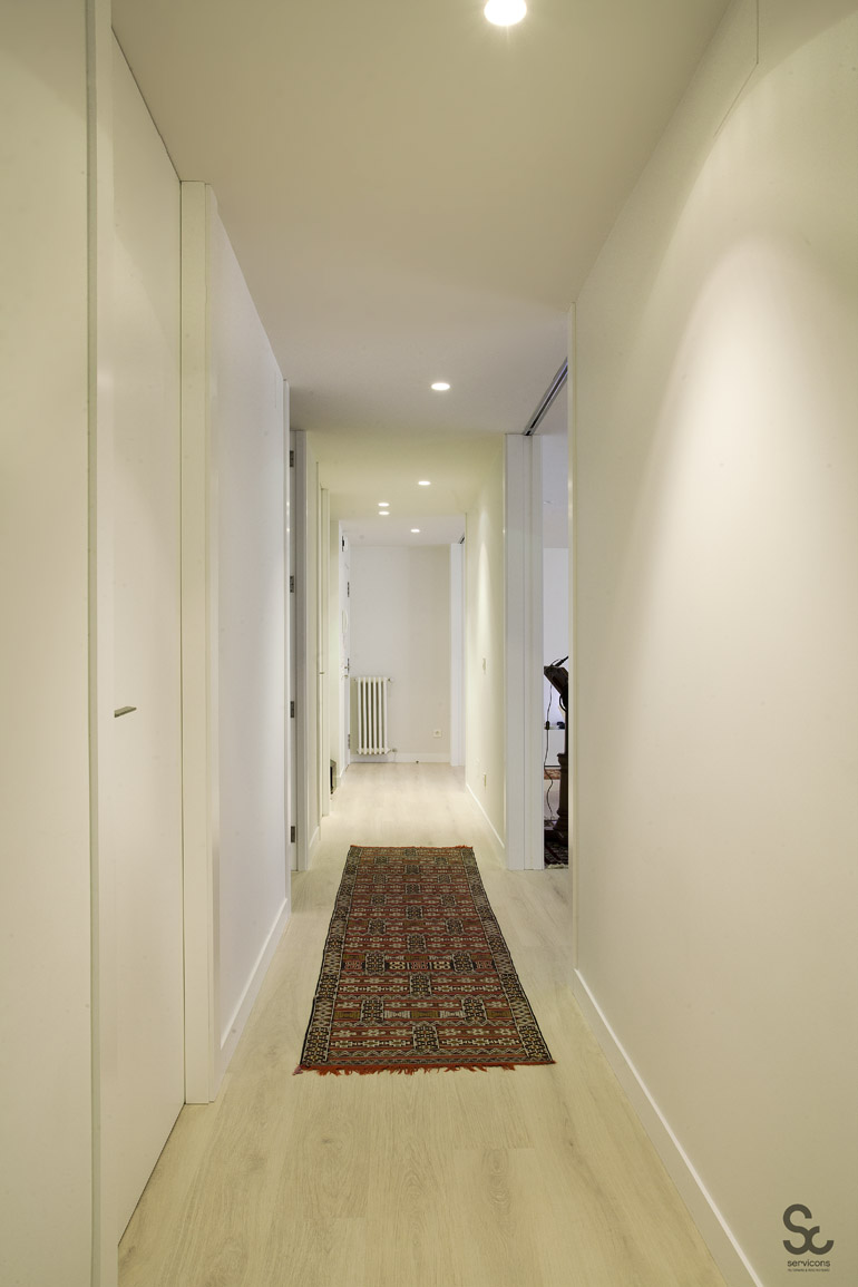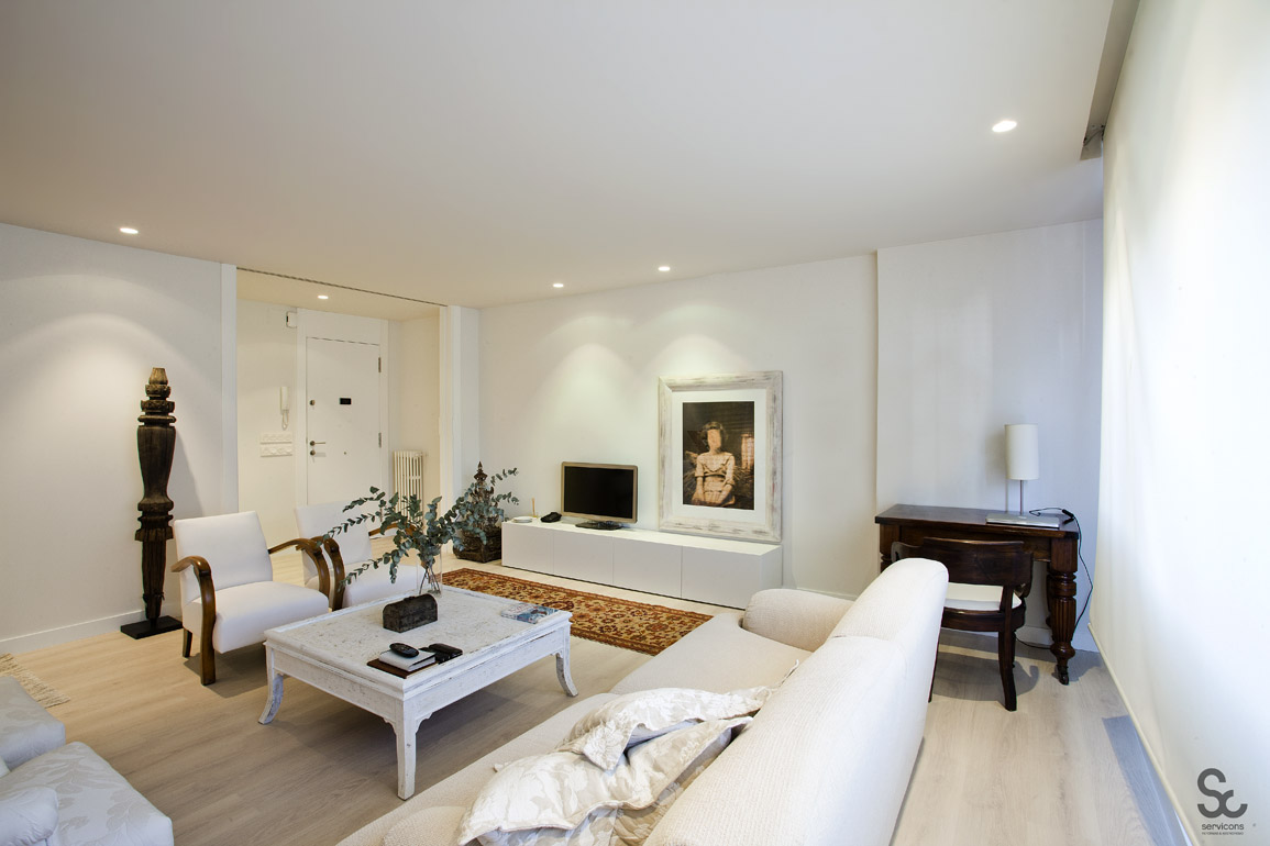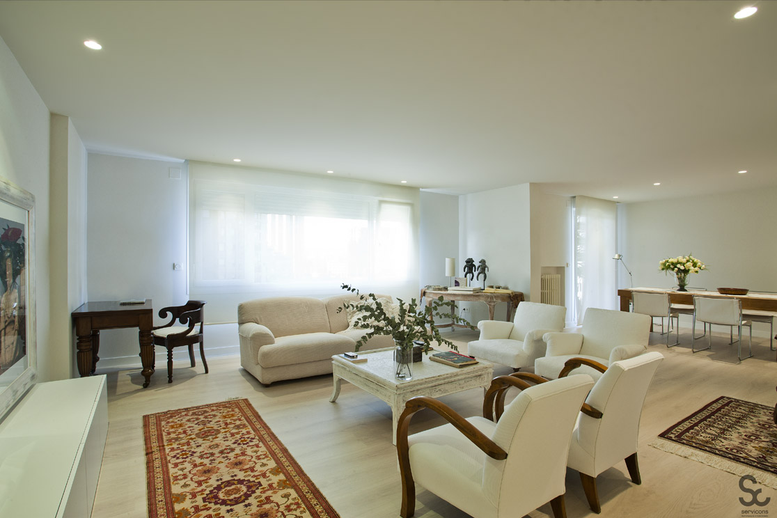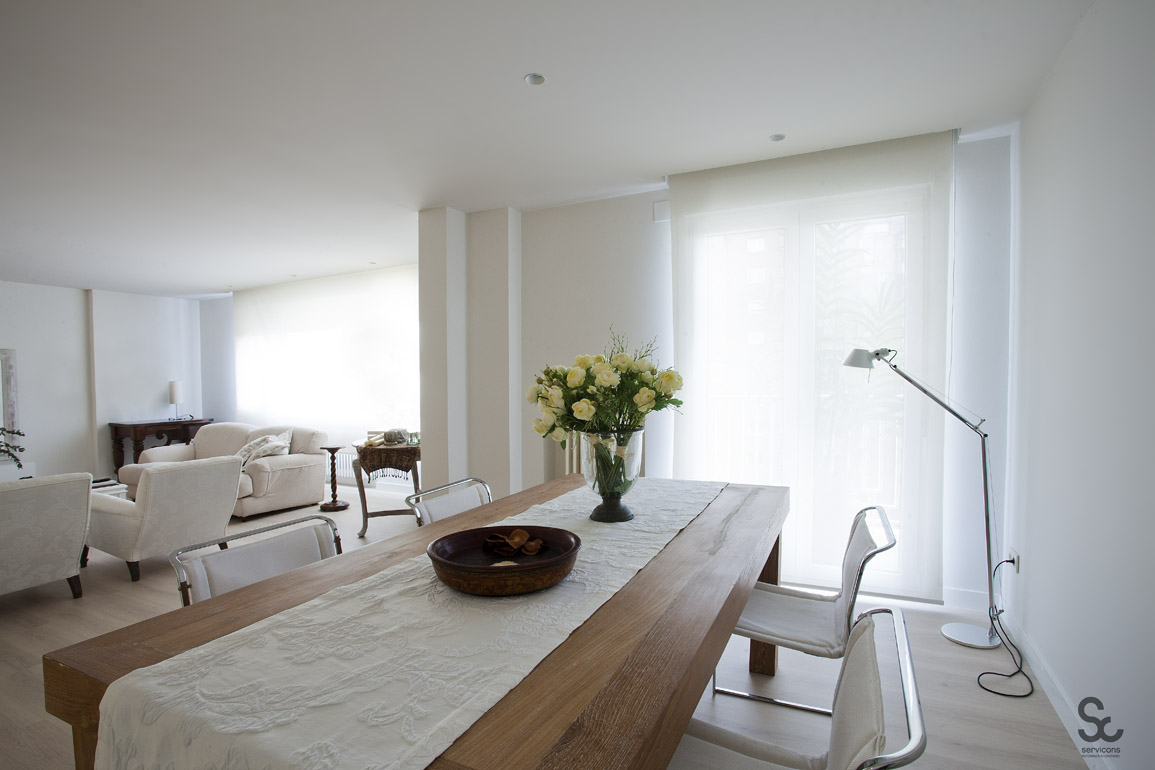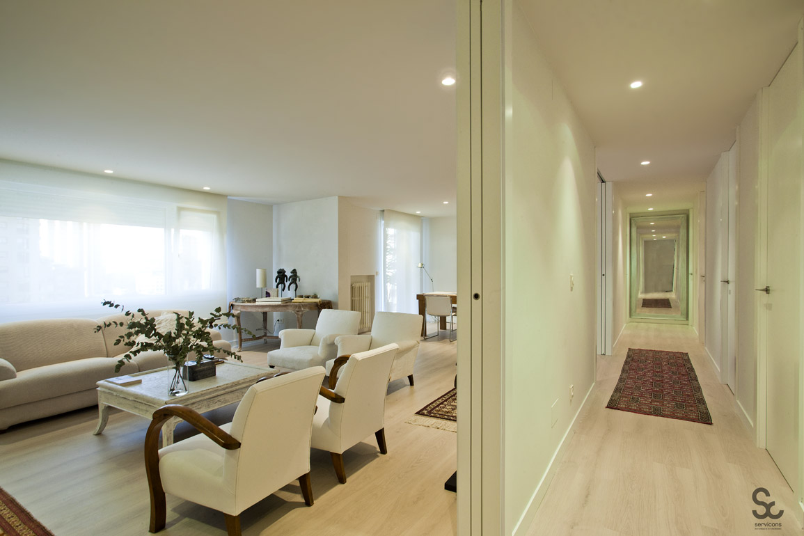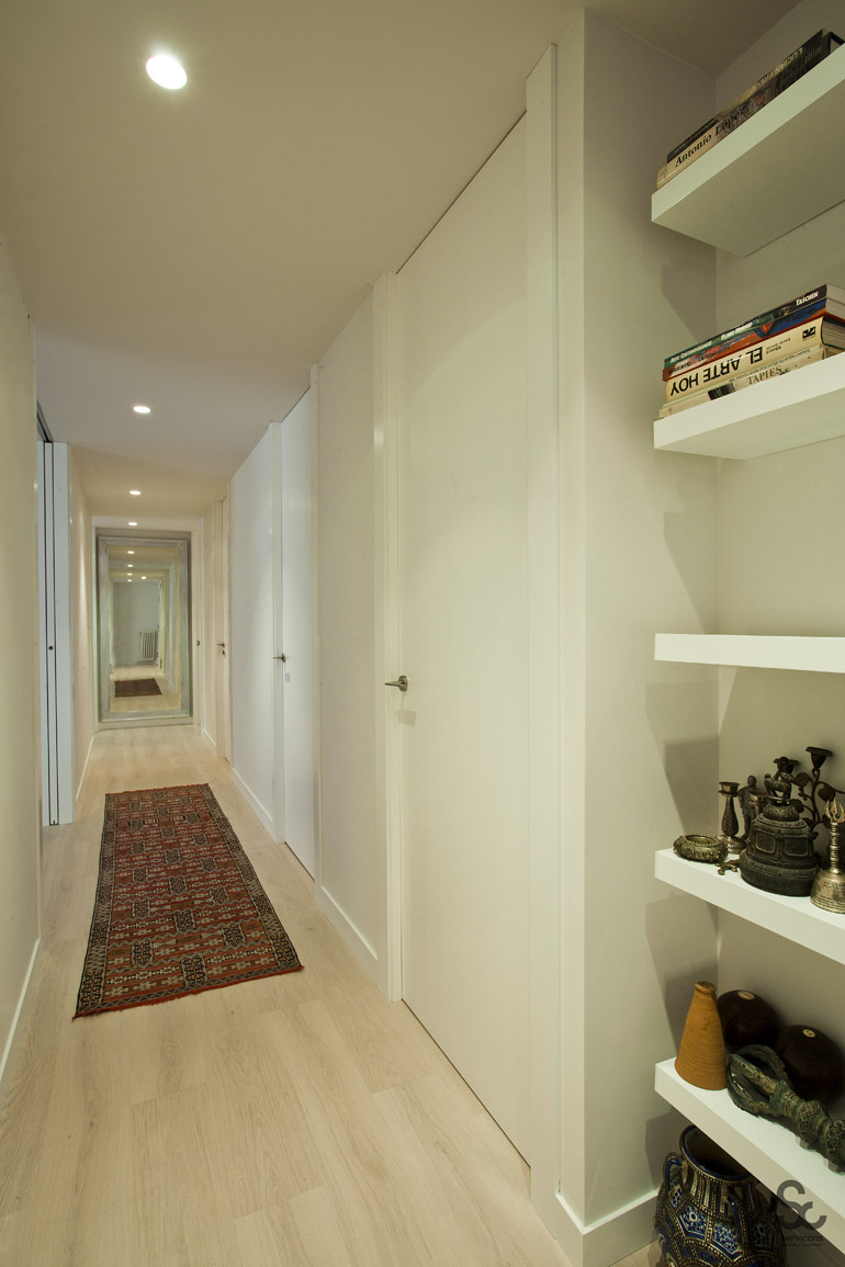 Reforma integral de vivienda con cambios de distribución. El piso contaba en origen con 4 dormitorios y 3 baños y pasó tras la reforma a 3 dormitorios y 2 baños para conseguir unos espacios más amplios y una ordenación más fluida. Se eligió una paleta de colores neutros y claros para que aportaran luz y sensación de espacio y destacaran el escogido mobiliario de la propiedad.