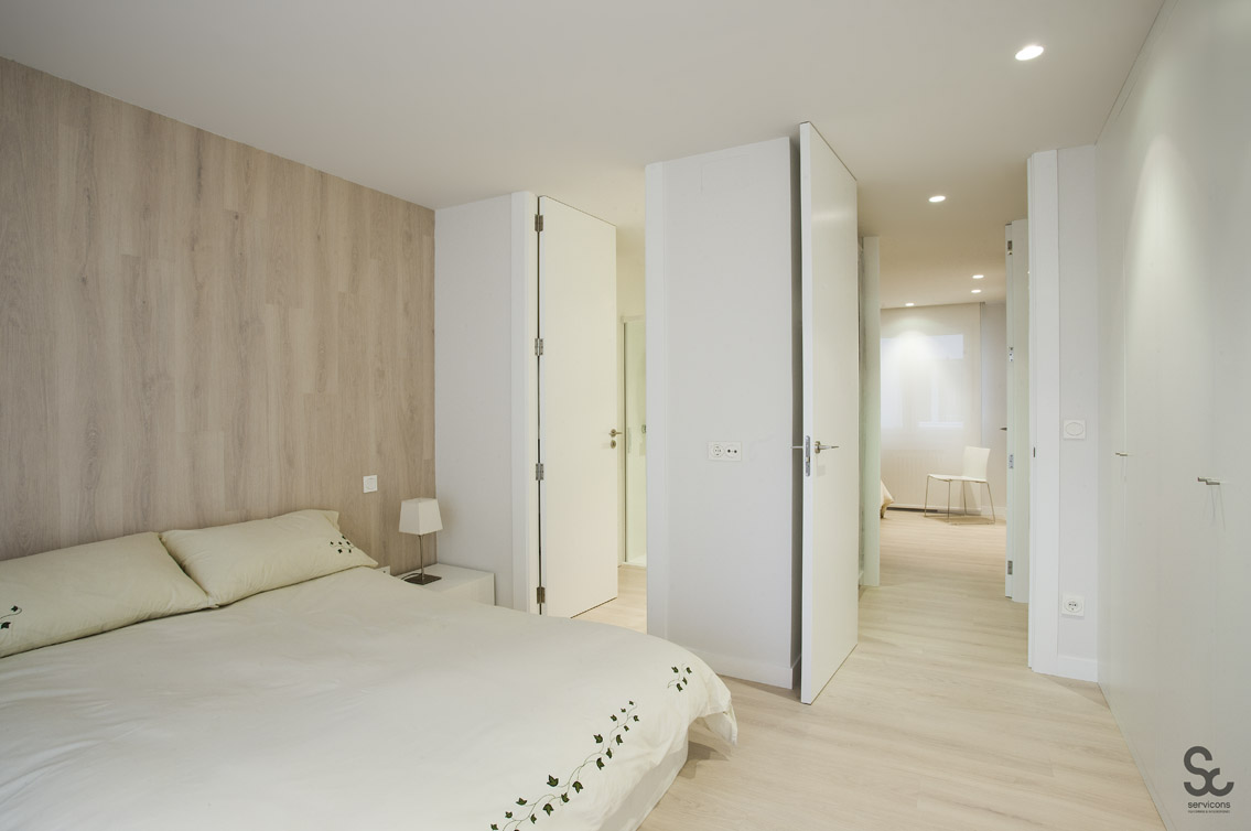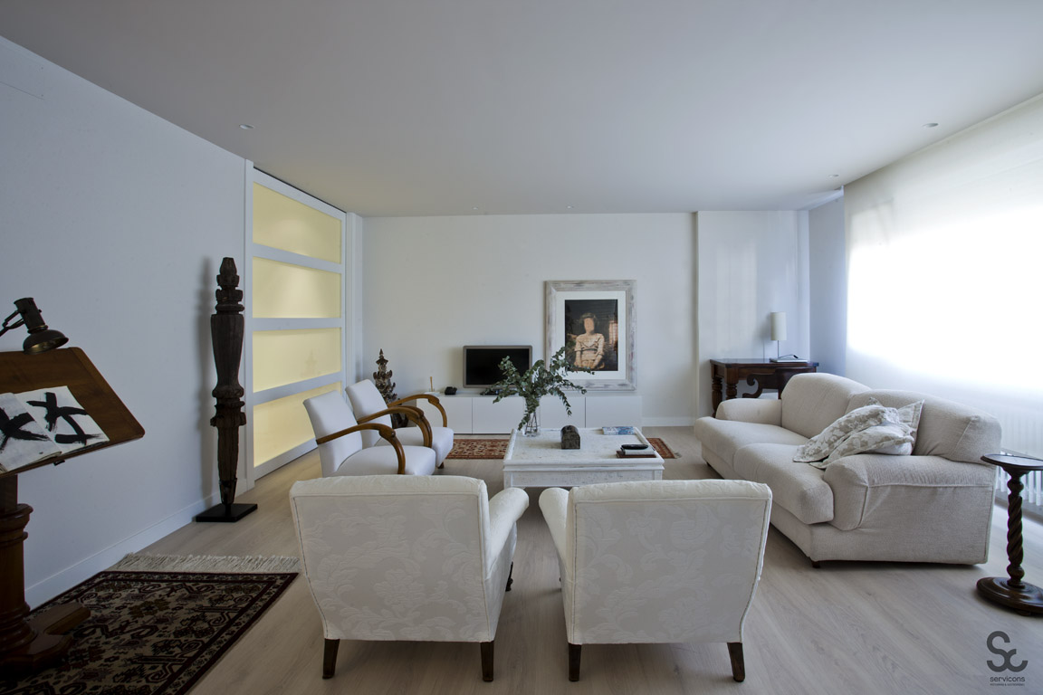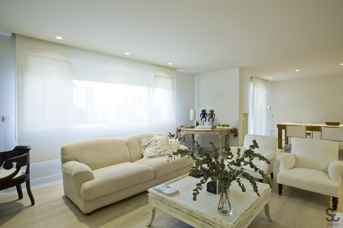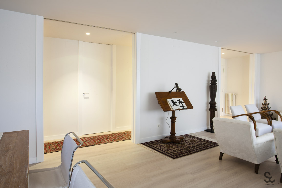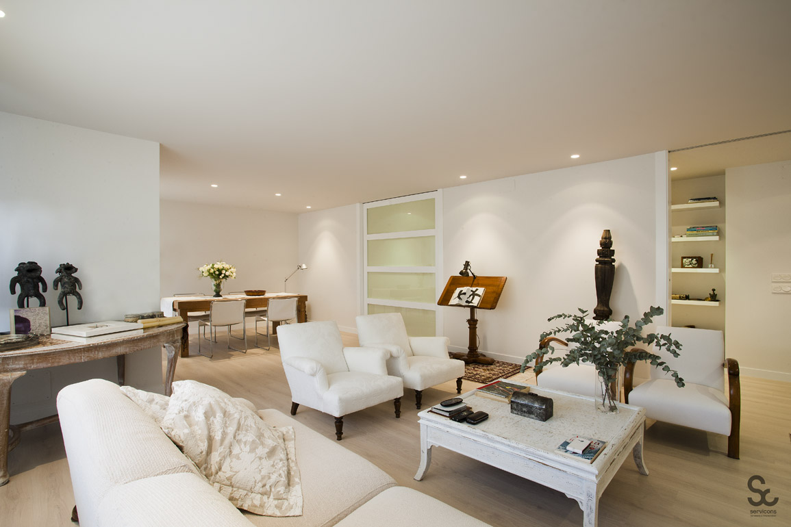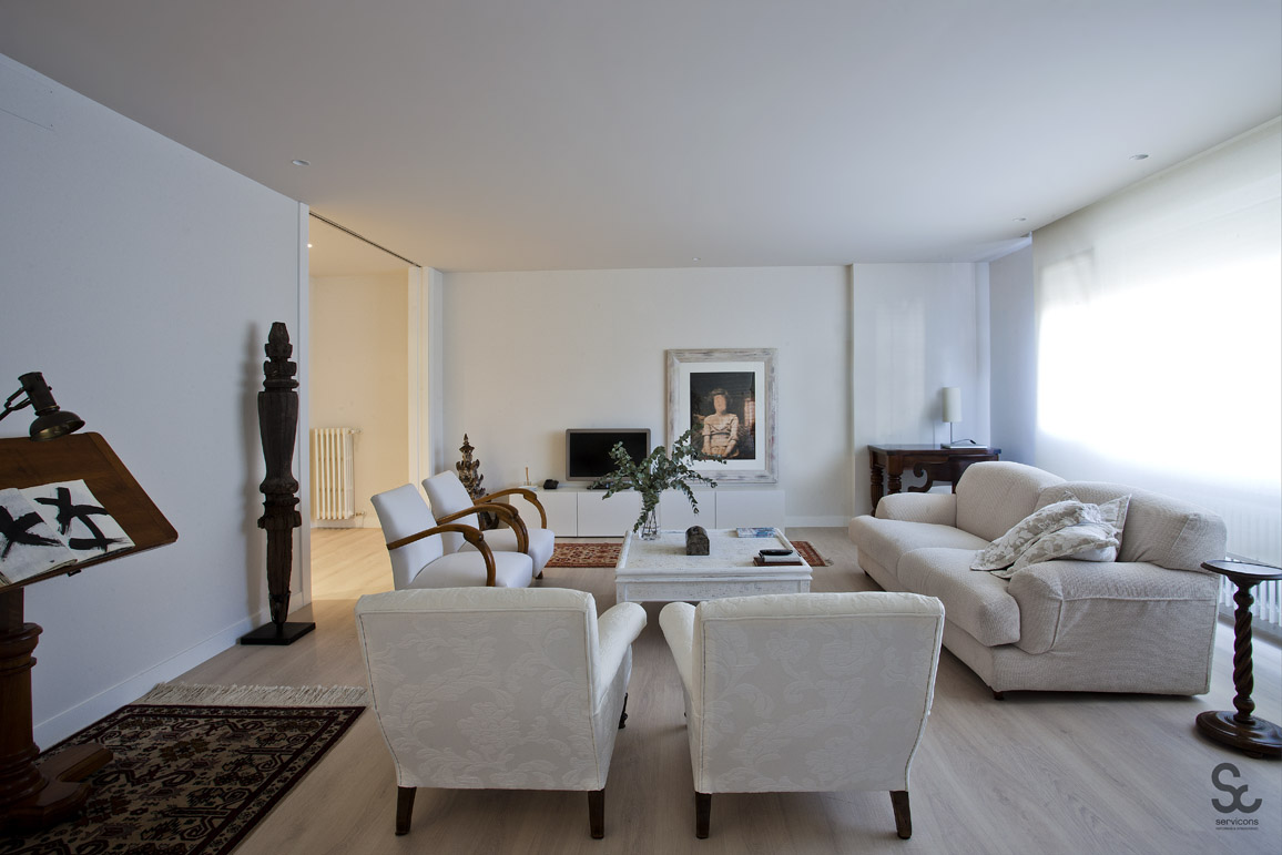 Reforma integral de vivienda con cambios de distribución. El piso contaba en origen con 4 dormitorios y 3 baños y pasó tras la reforma a 3 dormitorios y 2 baños para conseguir unos espacios más amplios y una ordenación más fluida. Se eligió una paleta de colores neutros y claros para que aportaran luz y sensación de espacio y destacaran el escogido mobiliario de la propiedad.