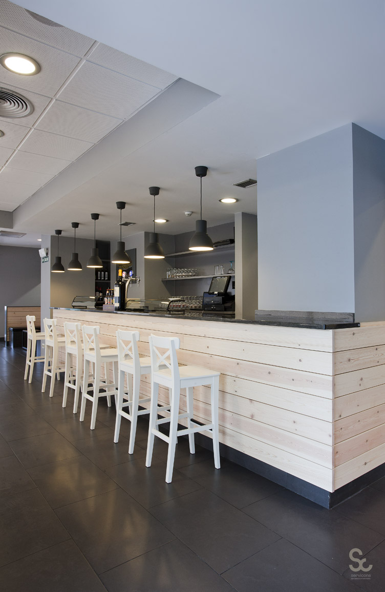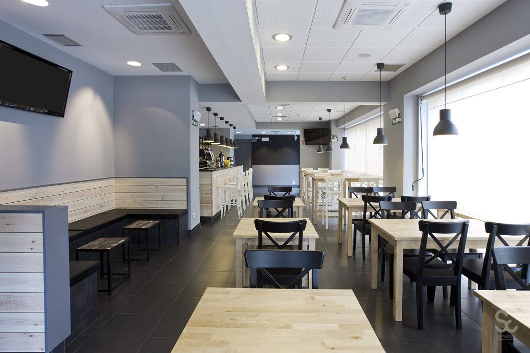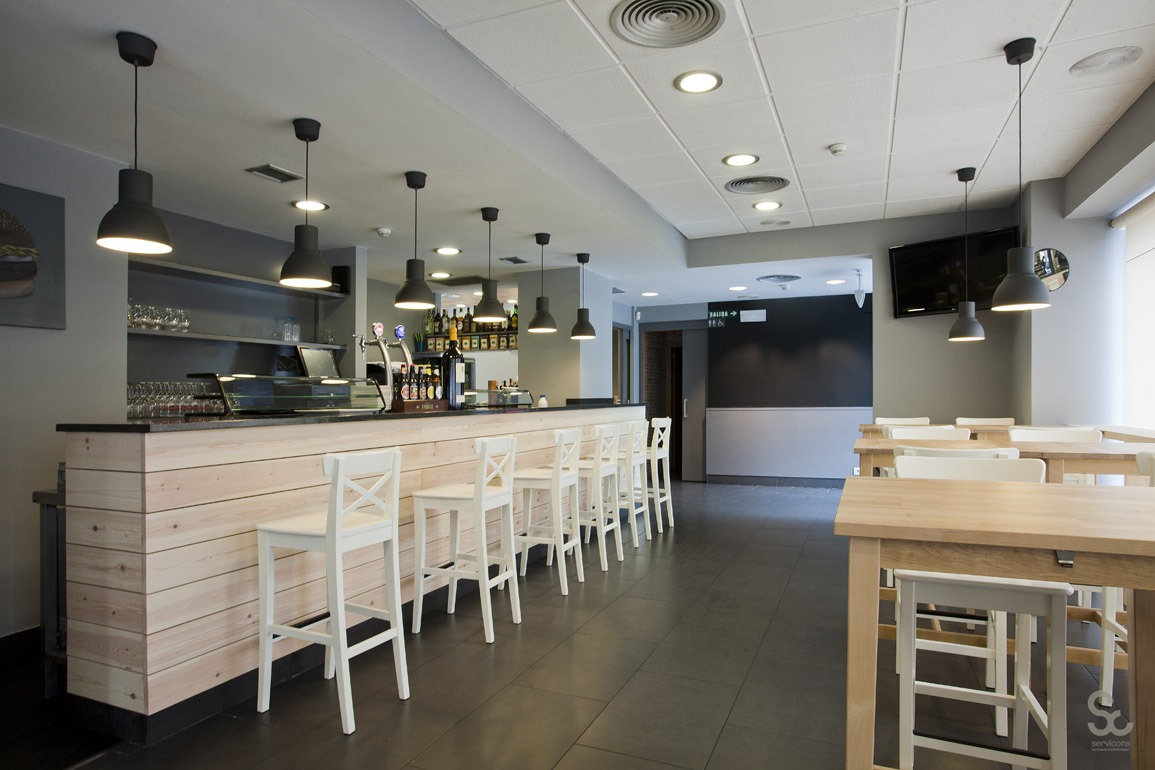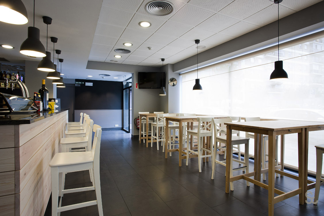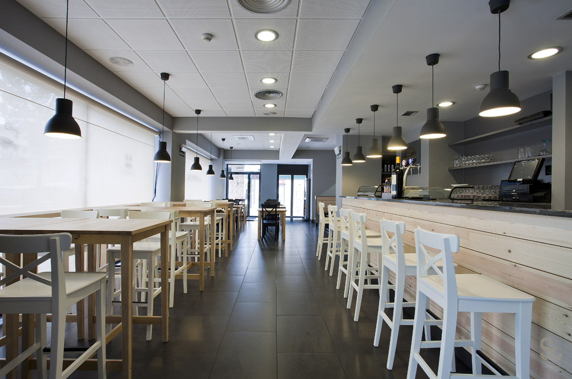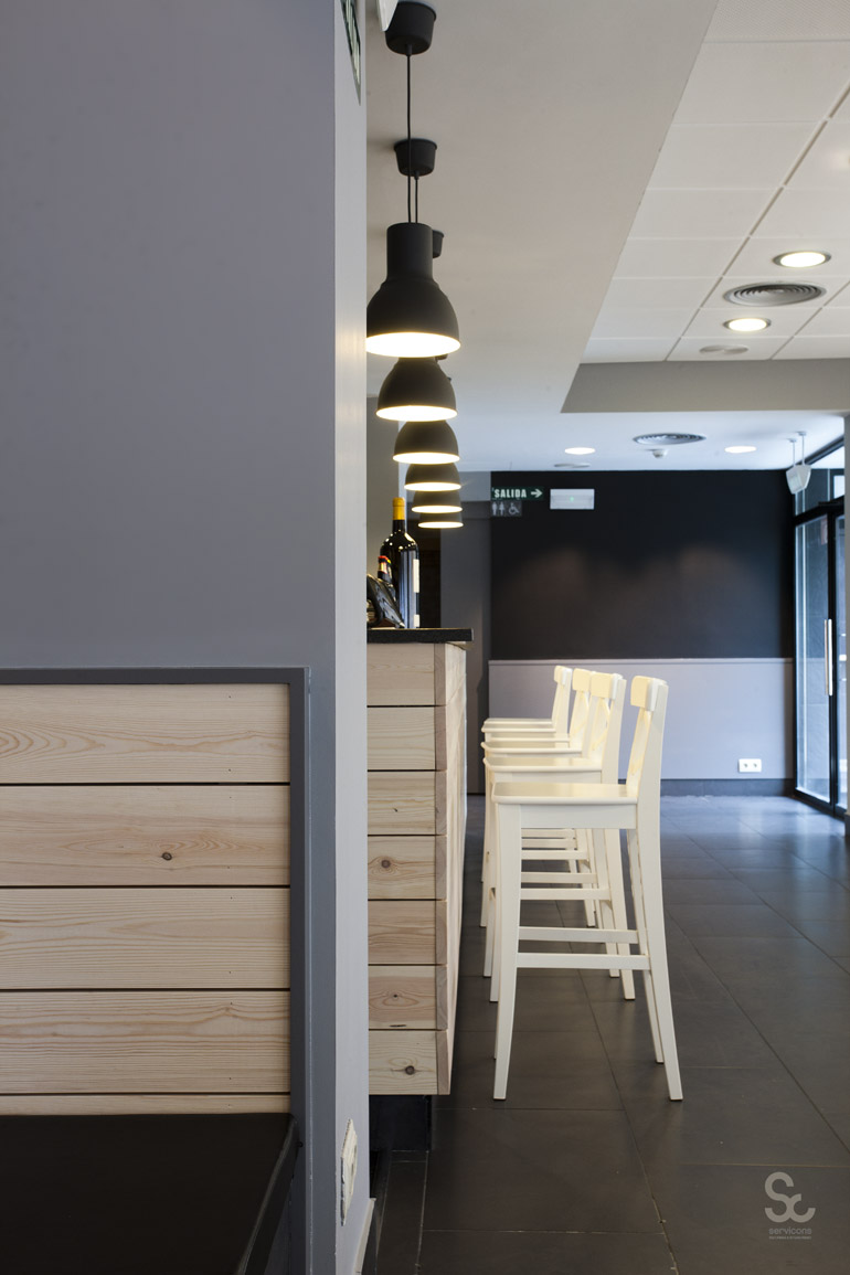 propietarios. Se apostó por eliminar los colores chillones y los elementos y mobiliario con brillo que le daban un aspecto de bar de autopista para dotarlo de una aire moderno, desenfadado y acogedor. Para ello se utilizó una paleta de colores grises y negros combinada con madera natural en parte de la decoración y el mobiliario y se creó una iluminación focalizada mediante lámparas colgantes de aspecto industrial.
