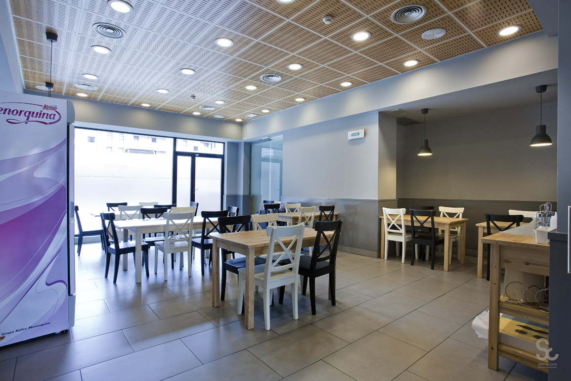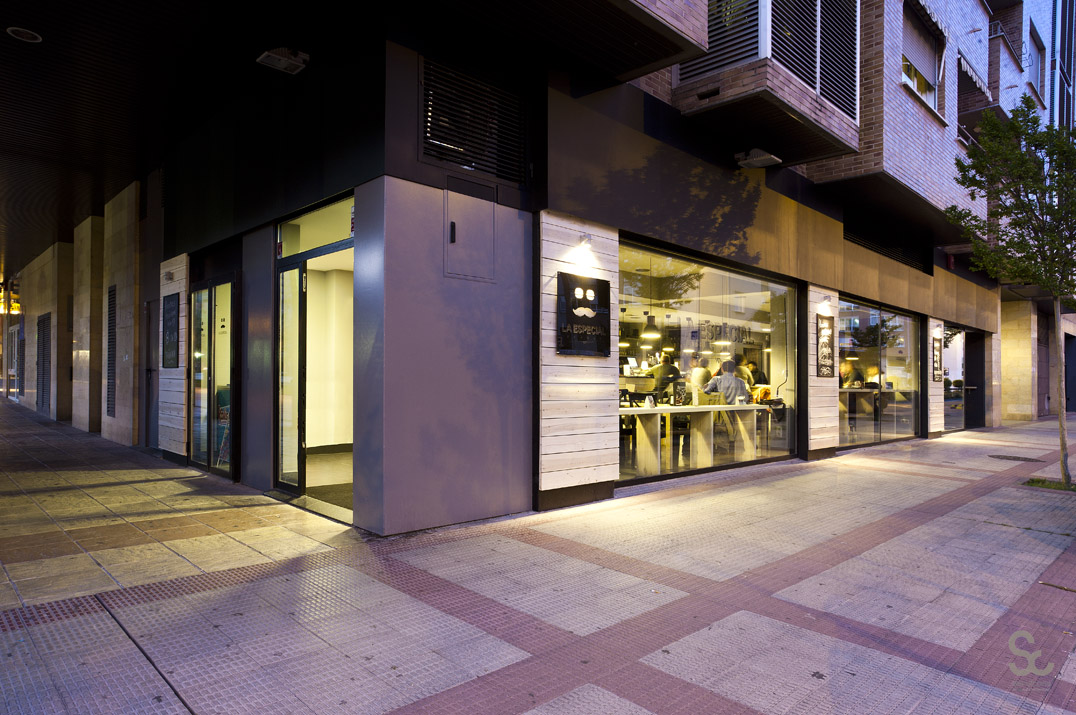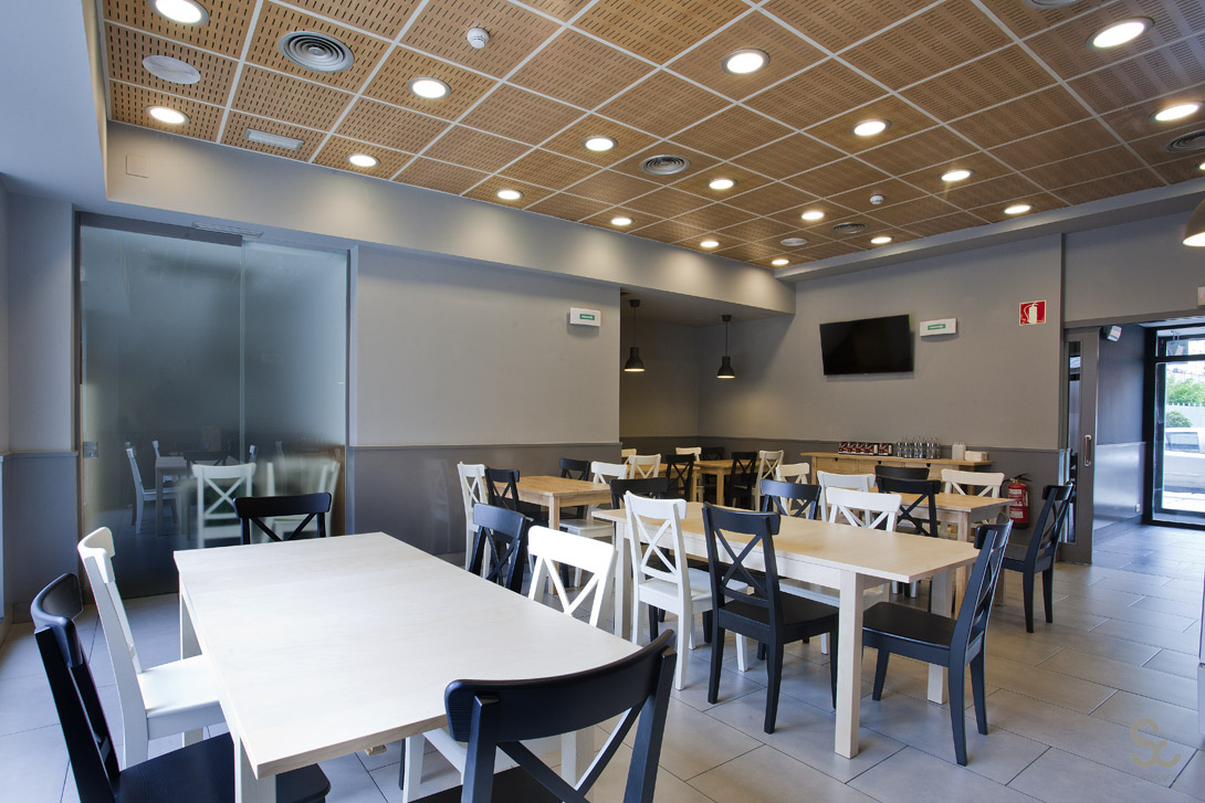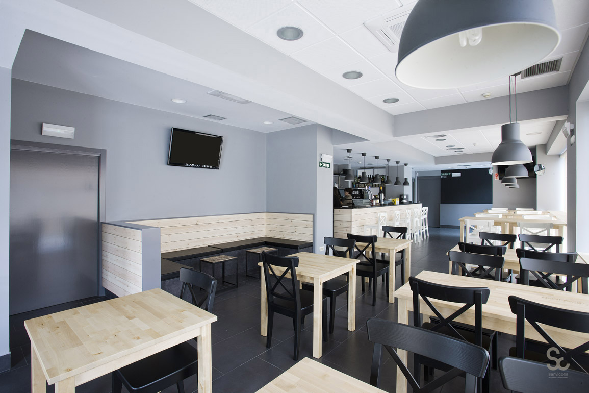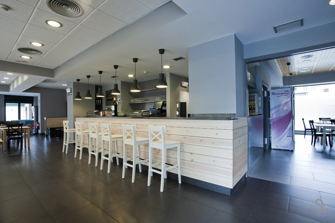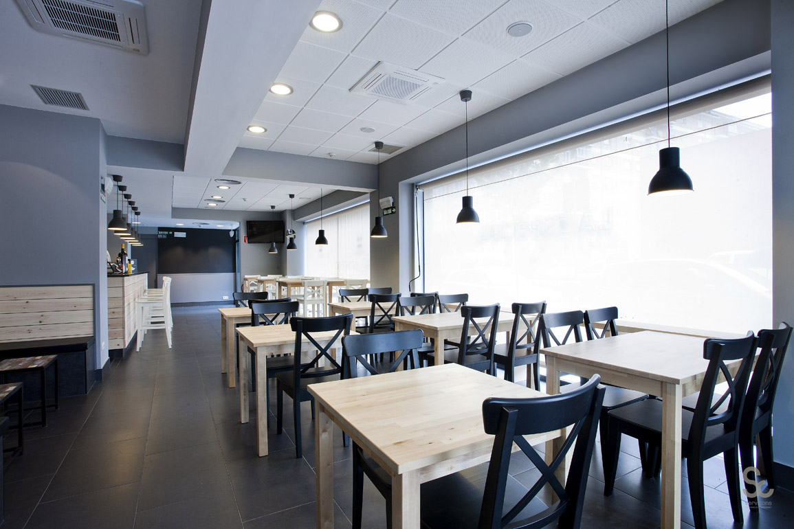 propietarios. Se apostó por eliminar los colores chillones y los elementos y mobiliario con brillo que le daban un aspecto de bar de autopista para dotarlo de una aire moderno, desenfadado y acogedor. Para ello se utilizó una paleta de colores grises y negros combinada con madera natural en parte de la decoración y el mobiliario y se creó una iluminación focalizada mediante lámparas colgantes de aspecto industrial.