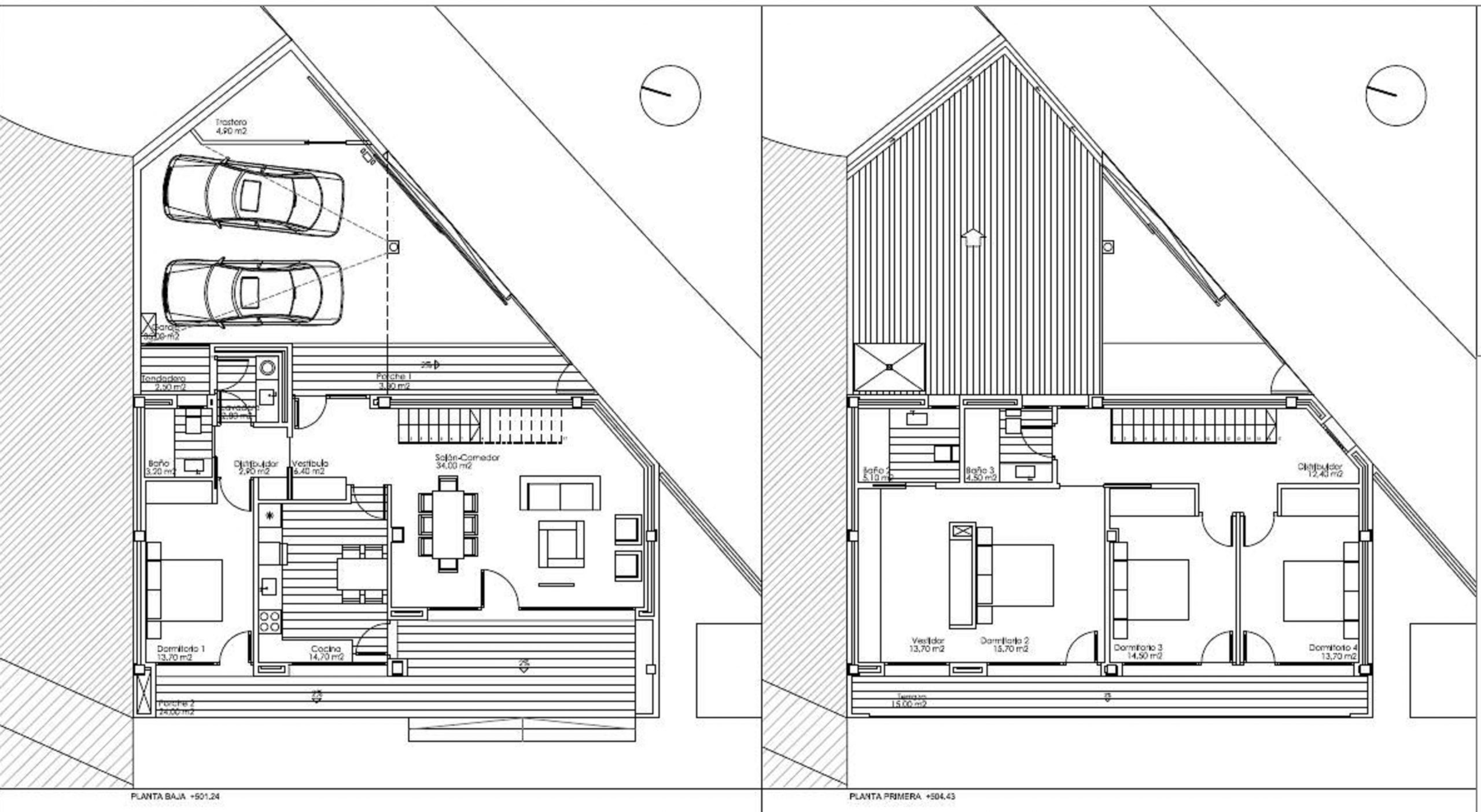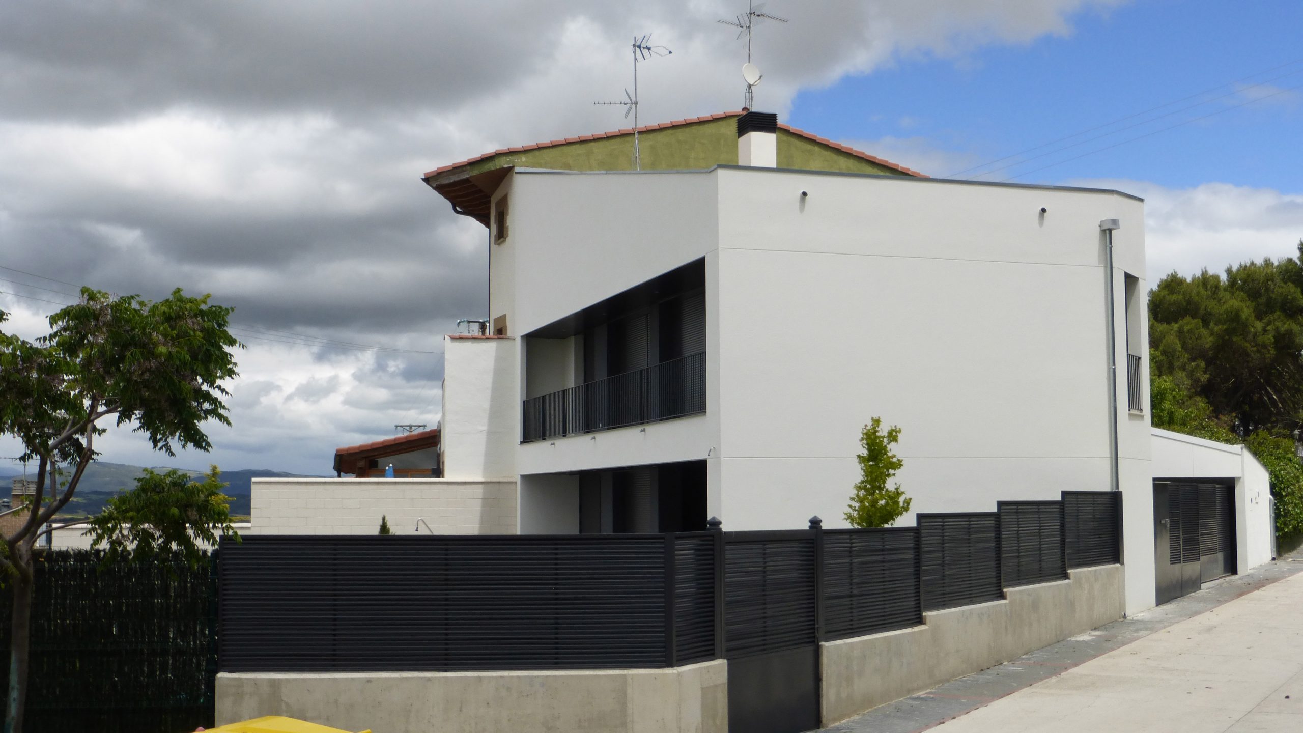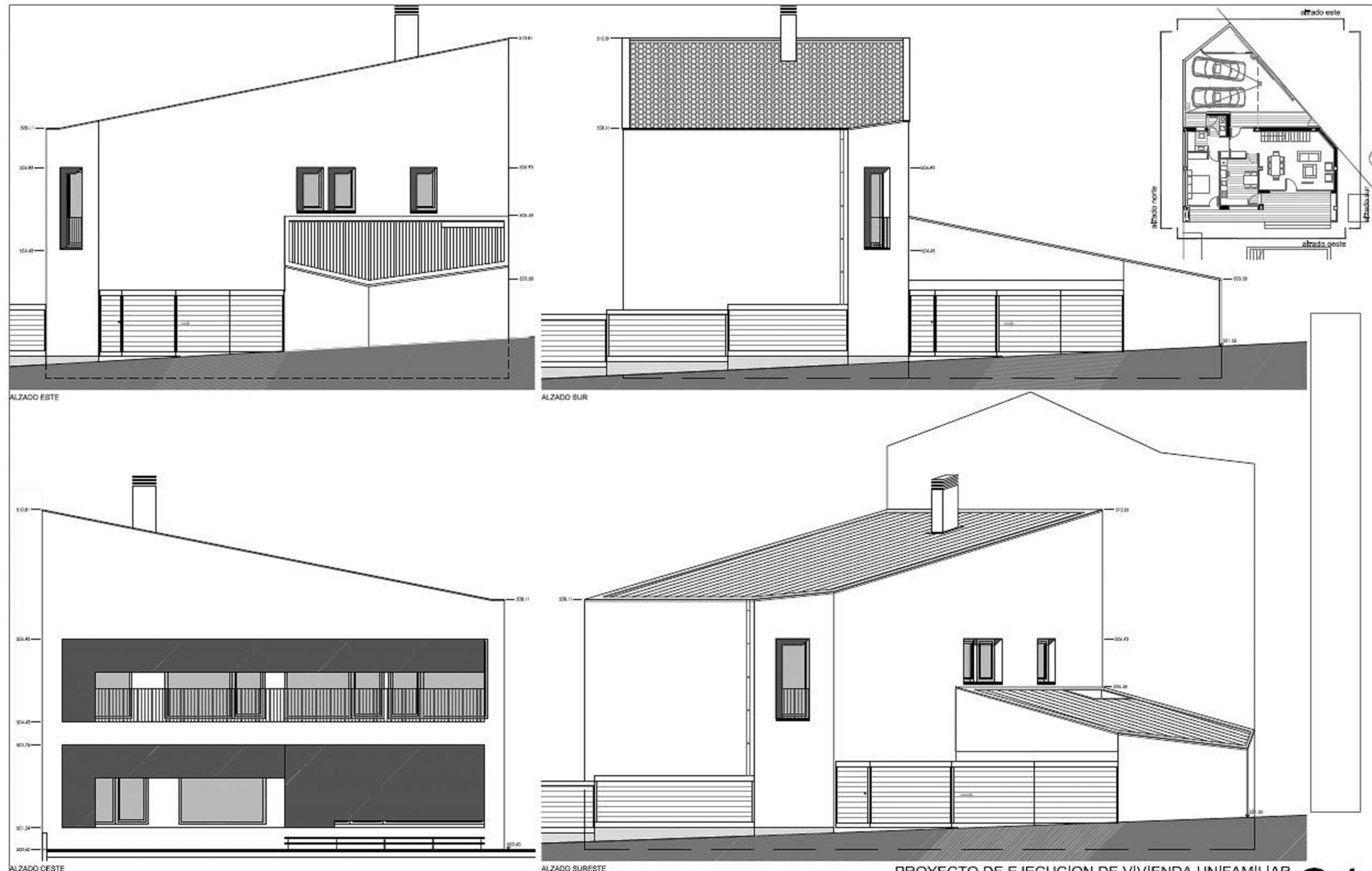dimensiones en su parte norte y las extensas vistas condicionan la posición y la forma de la vivienda proyectada. El edificio se desarrolla en dos volúmenes con cubierta inclinada a un agua, uno de vivienda de dos plantas y otro de garaje y trastero de una sola planta, situándose el acceso en el encuentro entre ambos. Tanto el salón, la cocina como los cuatros dormitorios disponen de grandes paños acristalados orientados a las vistas y protegidos por porche o terraza.