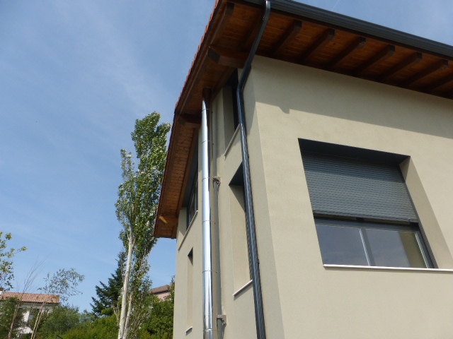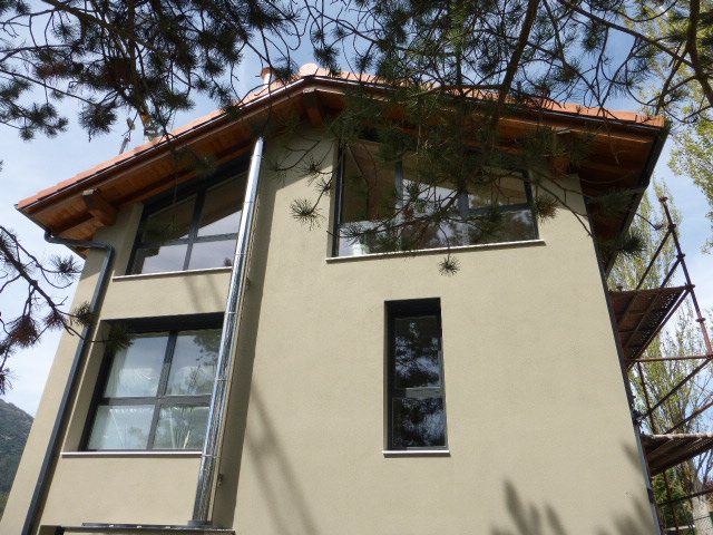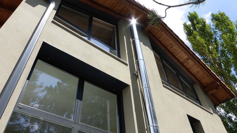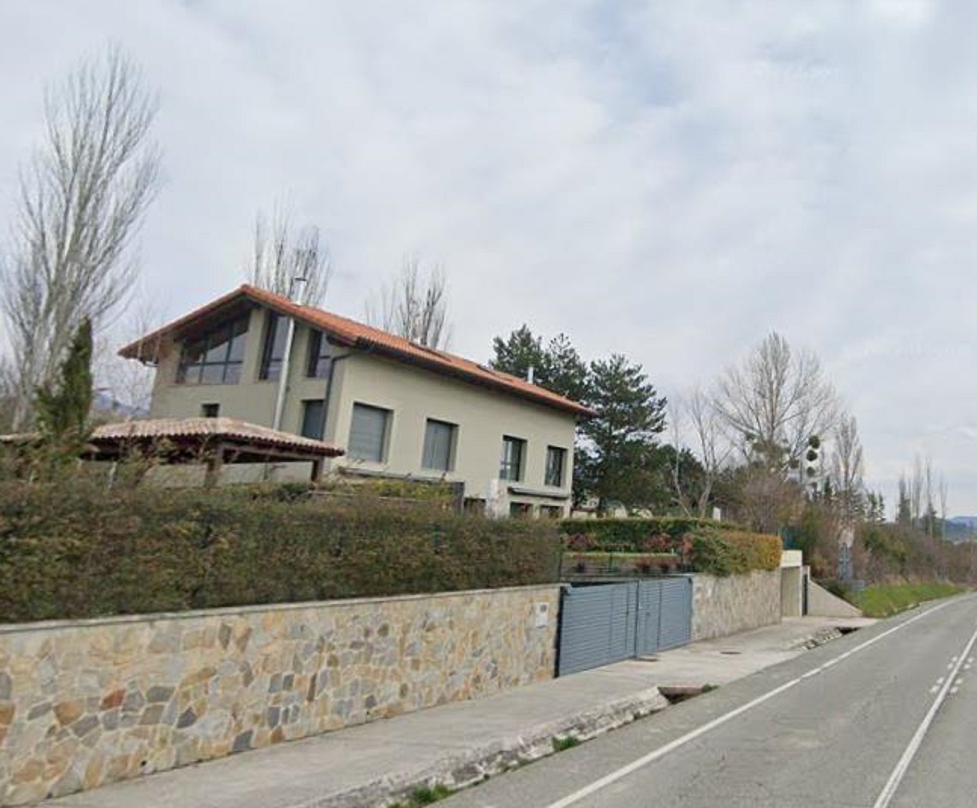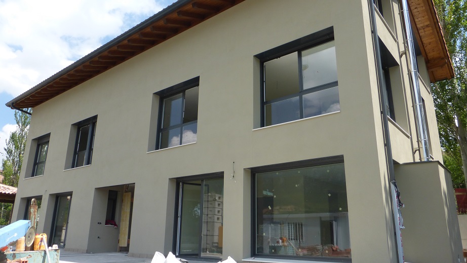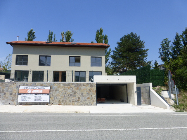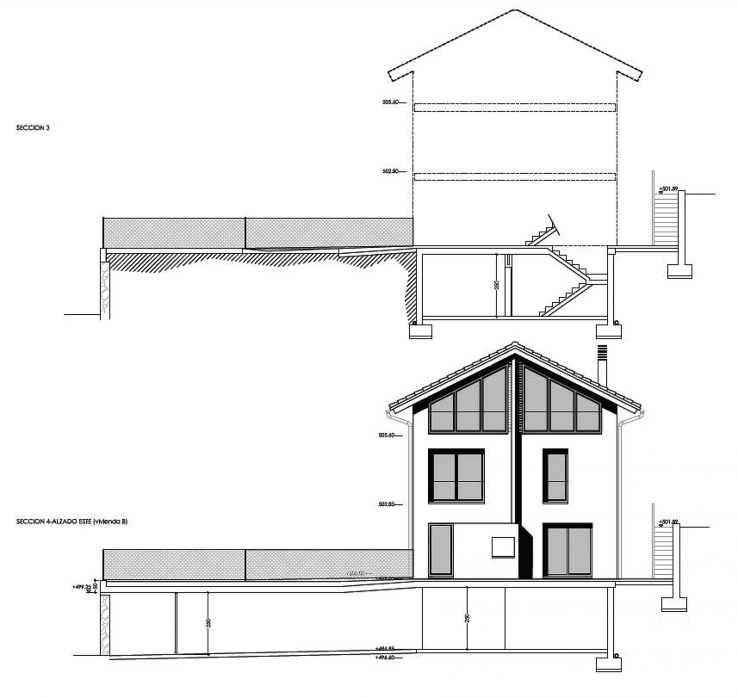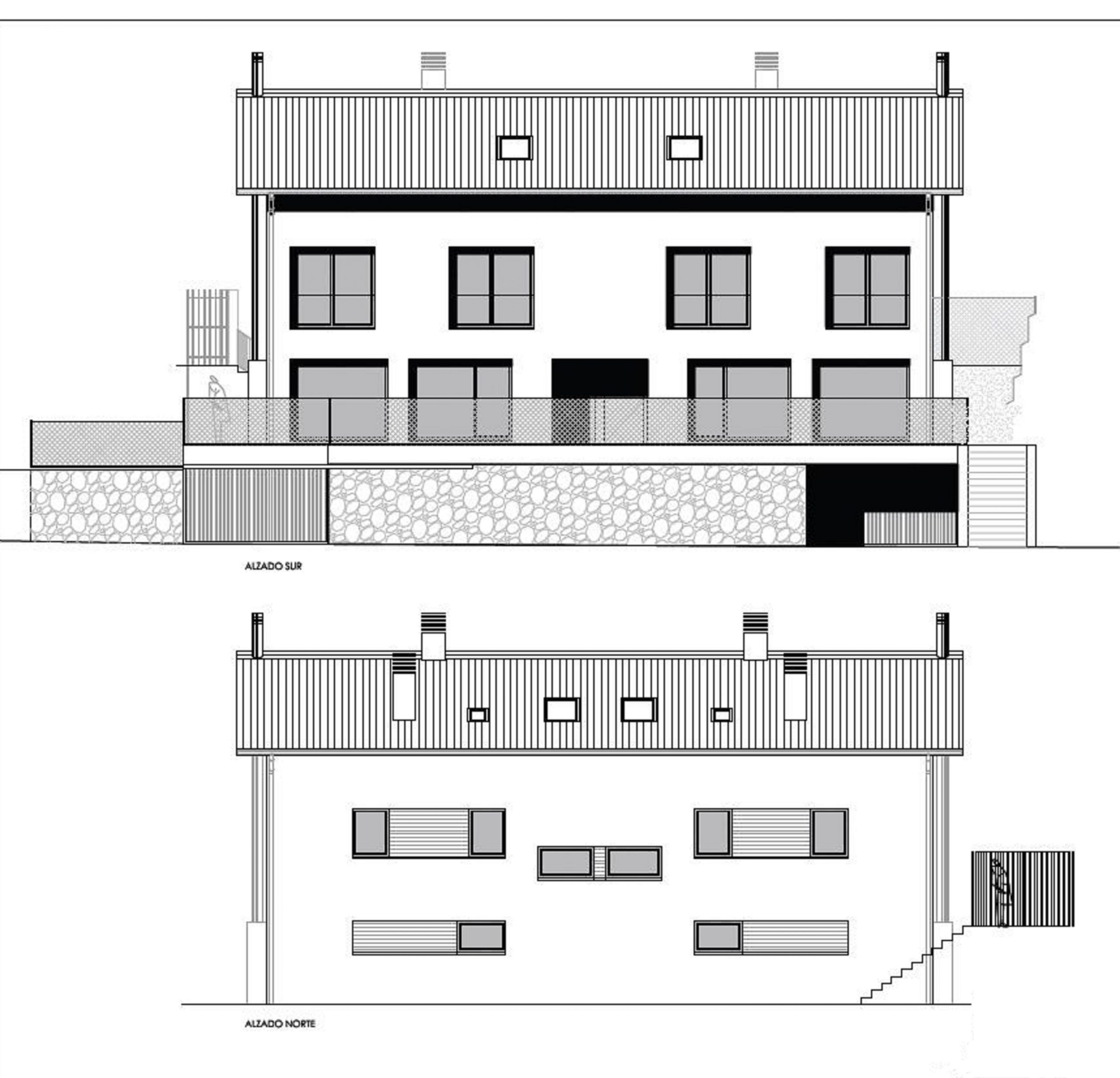 Vivienda bifamiliar aislada. El edificio se desarrolla en un sólo volumen con forma de prisma rectangular y cubierta a dos aguas y se sitúa sobre una plataforma en semisótano que contiene los garajes y absorbe el desnivel del terreno. A pesar de la forma tradicional de su volumen no se renuncia al uso de grandes ventanales desde todas las habitaciones para disfrutar de las vistas del paisaje.